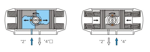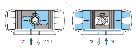 當氣源壓力從氣口(2)進入氣缸兩活塞之間中腔時,使兩活塞分離向氣缸兩端方向移動,兩端氣腔的空氣通過氣口(4)排除, 同時使兩活塞齒條同步帶動輸出軸(齒輪)逆時針方向旋轉。反之氣源壓力從氣口(4)進入氣缸兩端氣腔時,使兩活塞向 氣缸中間方向移動,中間氣腔的空氣通過氣口(2)排除,同時使兩活塞齒條同步帶動輸出軸(齒輪)順時針方向旋轉。 (如果把活塞相對反方向安裝,輸出軸變為反向旋轉,即為雙作用反轉型)